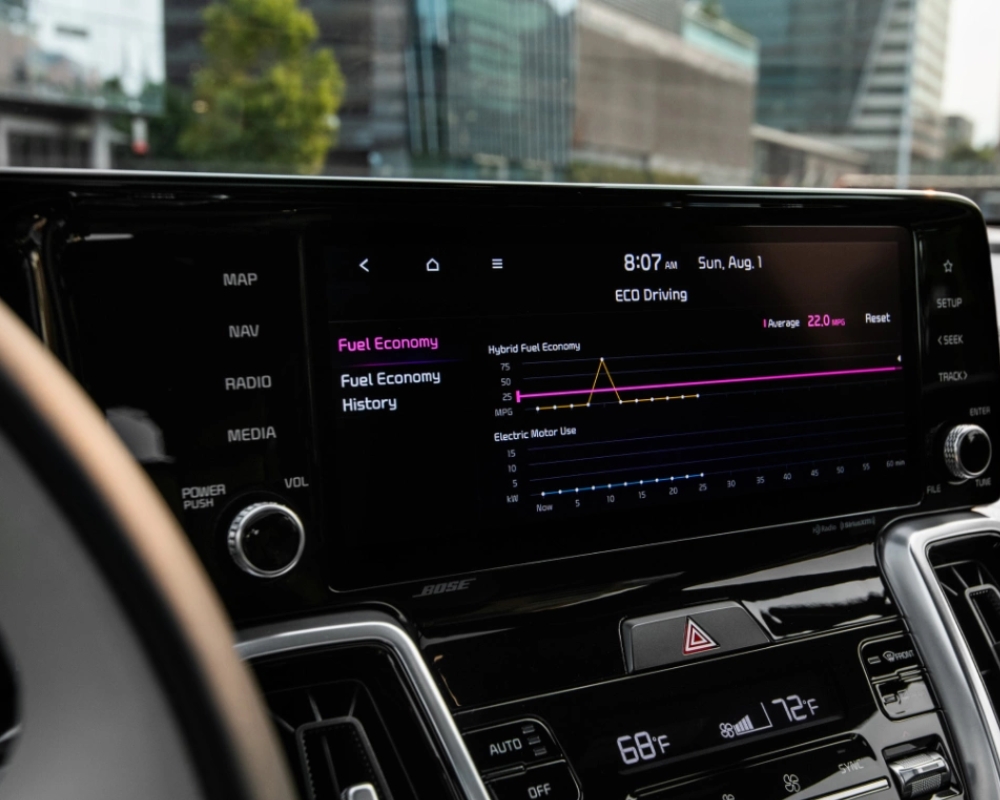 Step inside the 2024 Sorento HEV/PHEV, and you will find a wide array of infotainment and technology features. The SUV comes standard with the older interior design, which includes a 10.3-inch infotainment touchscreen. This user-friendly system allows you to easily navigate through various media options and connectivity features. Other tech enhancements include an optional wireless charging pad, a 12-speaker BOSE stereo system, and a rear-seat entertainment system.