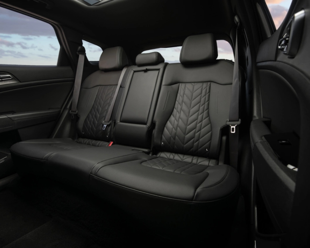 Inside, the striking design is highlighted by a large digital display on the dashboard and various eye-catching details throughout the cabin. The interior can be personalized with an attractive two-tone colour scheme or a more understated all-black option. The centre console features a rotary shift knob, a push-to-start button, and a collection of controls blended seamlessly into the piano-black bezel.